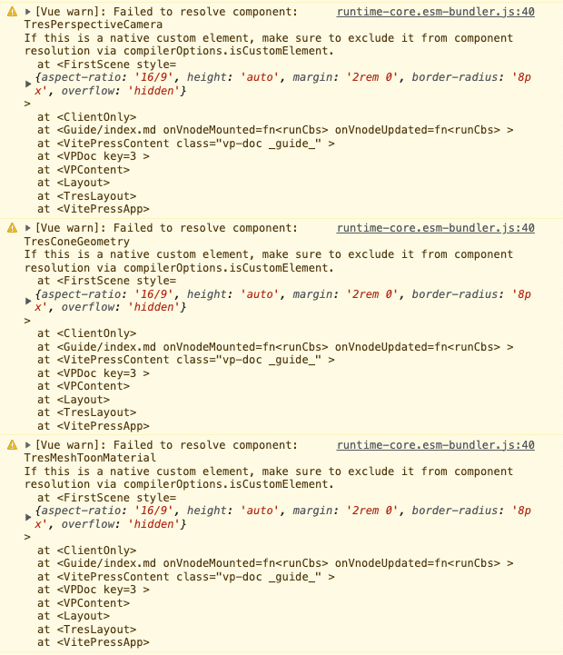 Since TresJS v2 is using a Vue Custom Renderer inside of the main Vue App instance, the core Vue renderer that acts as parent is not going to recognize the components inside of TresCanvas